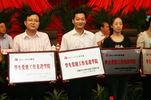 荣获“学生党建工作先进学院”,梅苑三号楼学生党员工作站获“红旗党员工作站”,本科2010级学生党支部获“先进学生党支部”,徐超航同学荣获“学生党员标兵”称号,杜振宇、晋明月、马安邦、于群、周华、李念泽等6名同学荣获“优秀学生党员”称号。魏静老师被评为“优秀组织员”。院党委书记章毛平等师生党员代表上台接受了学校领导的颁奖。