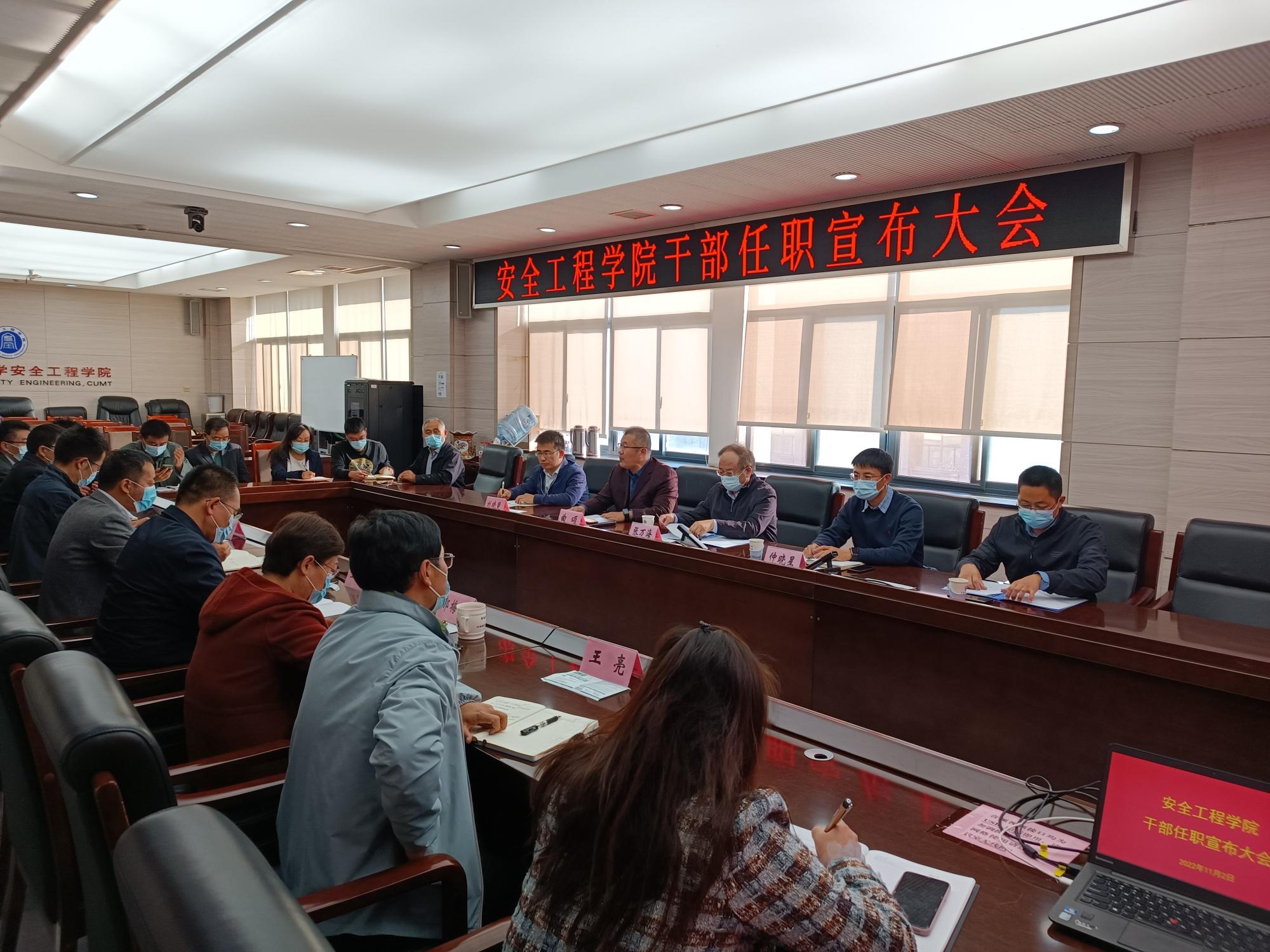 11月2日下午,安全学院在矿业科学中心A412召开干部任职宣布大会。校党委常委、组织部部长张万海出席会议。学院领导班子成员及教师代表参加会议,会议由院党委书记曲颂主持。