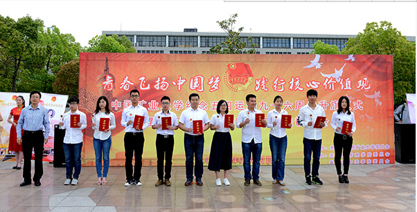 在南湖校区国旗广场举行纪念五四运动96周年升旗仪式暨2015年共青团工作表彰大会。校党委副书记曹德欣,校团委书记李江涛等学校各机关负责领导以及相关学院党委书记和副书记出席了本次升旗表彰仪式。安全学院党委副书记钱雄与辅导员老师带领全体学生参加了本次仪式。仪式由校团委副书记陈靓主持。