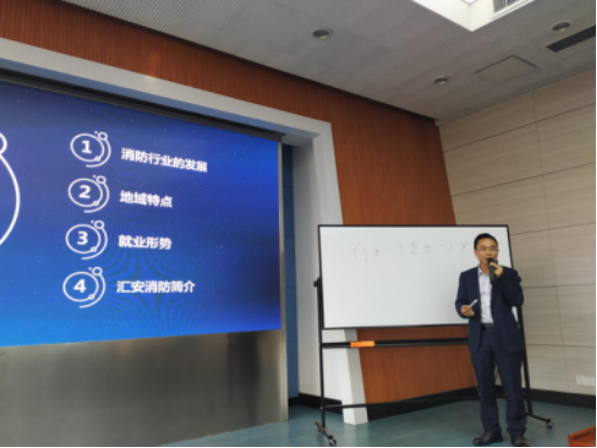 颁奖仪式结束后,邱平安先生为大家作了消防行业发展形势报告。他就当前消防行业的发展趋势、地域特点、就业形势等方面为同学们进行了详细的讲解,并一一解答了同学们感兴趣的问题。现场上对消防专业就业感兴趣或是有疑问的同学积极发言提问,邱平安先生也都一一做了详细的解答,同时欢迎优秀学子加入汇安公司。