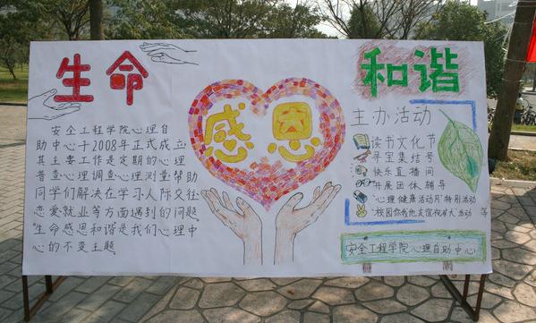 大学生心理自助中心设计了大学生心理健康调查问卷,供广大参与者填写。问卷内容设计包括“你觉得在大学生活,心理变化是怎样的”“对于大学课程的安排,你的感觉怎样”“进入大学是否会遇到任何感情问题”等共计十个问题。参与活动的同学将自己的心愿、理想或人生格言写在便笺纸上,纷纷表达了美好的人生祝愿。此外,大学生心理自助中心还特意制作了以感恩和谐为主题的宣传板,介绍了心理自助中心的发展历程,起到了很好的宣传作用。