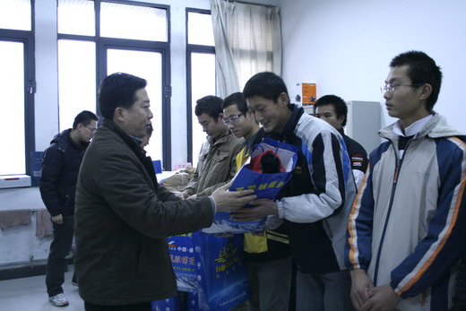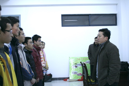 在会议室集中向09级家庭经济贫困学子发放寒衣。院党委副书记李金明,院团委书记、09级辅导员孙留涛老师以及接受寒衣补助的学生参加了寒衣发放仪式。
