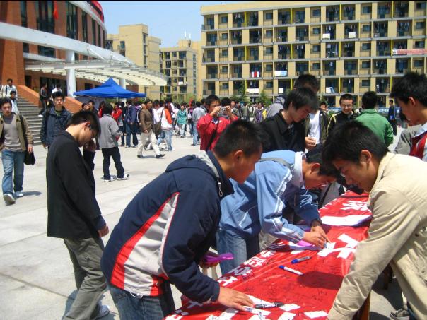 春季是个传染病多发的季节,为了让同学们更多地了解饮食健康方面的常识,防止“病从口入”,使同学们能有一个良好的饮食习惯,4月23日中午,由安全学院学生会生活部和矿业学院维权实践部主办,消防07-1班和采矿07-6班承办的“科学饮食健康生活”签名倡议活动在二食堂门口成功举办。