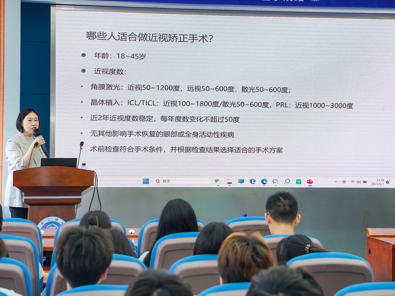 丁继存书记在致辞中感谢学院为此次活动提供的大力支持,并简要介绍了市一院眼科的发展历史。他指出,眼健康问题关系到青年人才的健康成长和国家的未来,在近视防治被上升至国家战略层面的大背景下,此次走进大学校园的眼健康科普活动具有重要的意义。他希望通过此次活动,双方能够各自发挥优势,不断加强合作。