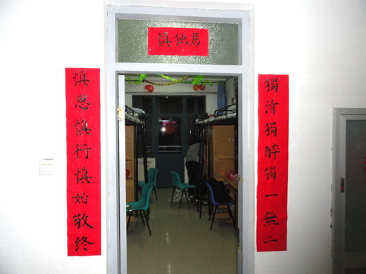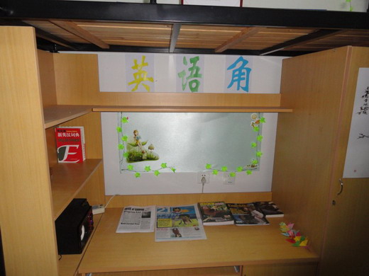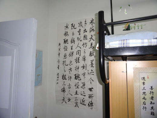各年级参加宿舍文化节的宿舍全面开展。在检查过程中,生活部工作人员主要对宿舍阳台、厕所、门窗等卫生死角进行细致的检查,并参观了各个宿舍内的人文设计。在卫生方面,由于军训的洗礼,10级学生宿舍整体表现十分出色,干净的地面、整洁的床铺,各卫生死角也十分清洁。在宿舍人文设计方面,宿舍成员纷纷施展才华。简洁的标志、行云流水的书法、清新亮丽的图画让宿舍环境增添了不少韵味。此外,诸如环保箱、读书角、英语园地等设计也为宿舍多了几分人文气息。