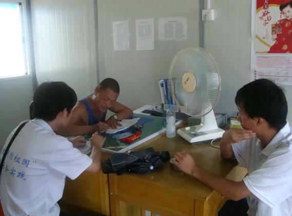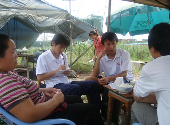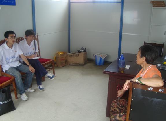 随后,我们开始了实践团的采访工作。大多数群众对实践团的采访工作给予积极配合,并认真地答完问卷。在与群众的交流中,实践团成员充分感受到灾区人民的热情、善良与朴实,并对他们乐观豁达的心态所感染,他们纷纷表示了对国家和人民的感激之情,并期望能早日住进真正的新房。