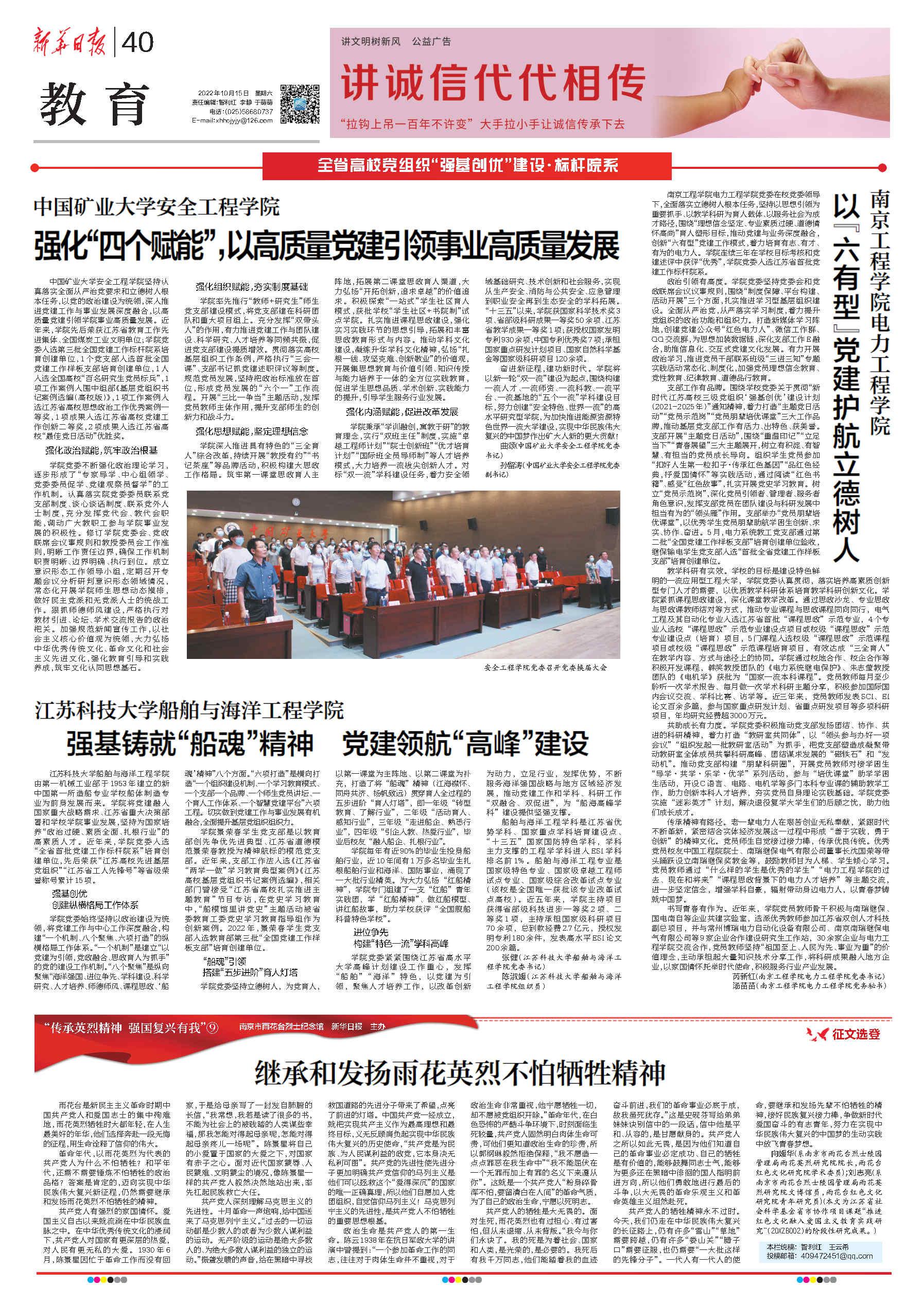 近年来,学院认真落实全面从严治党要求和立德树人根本任务,以党的政治建设为统领,深入推进党建工作与事业发展深度融合,以高质量党建引领学院事业高质量发展。先后荣获江苏省教育工作先进集体、全国煤炭工业文明单位;学院党委入选第三批全国党建工作标杆院系培育创建单位,1个党支部入选首批全国党建工作样板支部培育创建单位,1人入选全国高校“百名研究生党员标兵”,1项工作案例入围中组部《基层党组织书记案例选编(高校版)》,1项工作案例入选江苏省高校思想政治工作优秀案例一等奖,1项成果入选江苏省高校党建工作创新二等奖,2项成果入选江苏省高校“最佳党日活动”优胜奖。