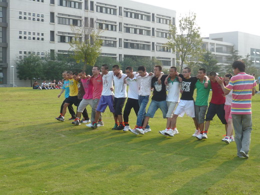到达目的地后,为了进一步增进同学间的认识和了解,进而相继开展了“我是谁”趣味介绍活动和“同舟共济 共同前行”十五人绑腿赛跑活动。各个团队分别派出代表队积极组织练习,在随后的比赛中团结协作,共同努力,将活动一再推向高潮。之后一百五十多位新生共同开展的“叠长城”活动,同学们相互叠坐围成一圈,互相依靠互相支撑。活动中,同学们不仅收获了快乐,还感悟到了团队责任的重要性。