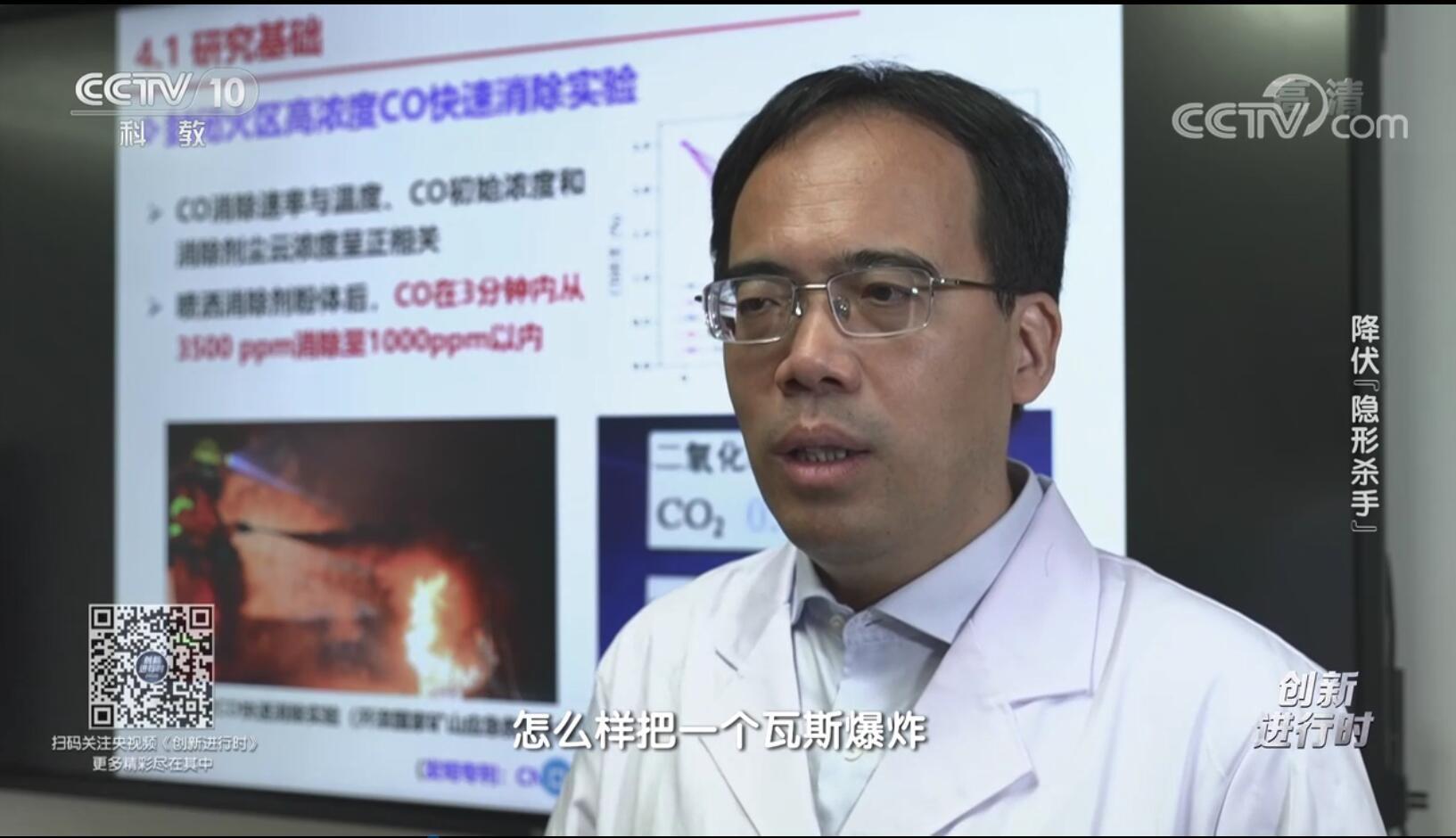 火灾爆炸事故产生的一氧化碳是造成人员群死群伤的重要原因,一氧化碳的快速处置一直是制约应急救援效率的主要因素。片中介绍,自亲历矿井火灾事故并提出现场一氧化碳快速消除的理念后,周福宝教授带领科研团队经过长期技术攻关,发明了矿用高耐受性过渡金属一氧化碳消除剂及消除方法,研发了感控一体化及便携式一氧化碳消除装置。该研究成果在国家矿山应急救援开滦队进行全尺寸巷道火灾、爆炸的一氧化碳消除试验,并在“学习强国”、《科技日报》《光明日报》等刊物上报导,引起国内外广泛关注。