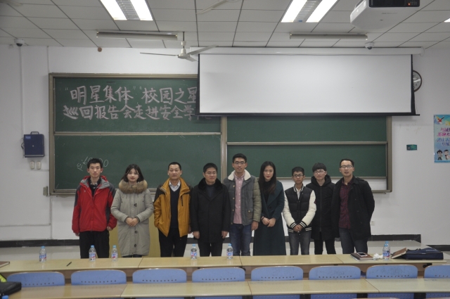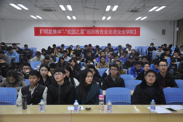 12月12日晚上,安全学院“明星集体”、“校园之星”巡回报告会在教学楼一C104举行,安全学院党委副书记钱雄、辅导员孙留涛、郑文奇以及安全学院2016级学生参加了报告会。