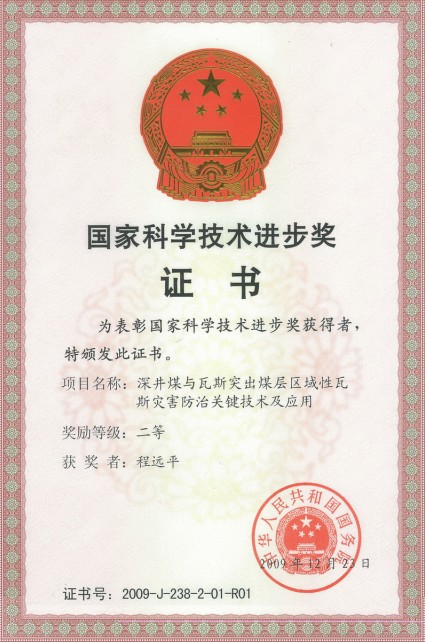 程远平教授等人多年潜心研究的成果“深井煤与瓦斯突出煤层区域性瓦斯灾害防治关键技术及应用” 荣获国家科学技术进步奖二等奖。该项目构建了以区域性瓦斯治理技术为核心,瓦斯灾害综合治理总体规划和管理保障相结合的深井煤与瓦斯突出煤层区域性瓦斯治理技术体系,并以此为基础制定了国家煤炭行业强制性安全标准《保护层开采技术规范》(AQ1050-2008)和《煤矿瓦斯抽采基本指标》(AQ1026-2006),本项目的部分研究成果被国家《防治煤与瓦斯突出规定》所引用。该成果先后在淮南、淮北、阳泉、郑州等10个矿业集团40多个矿井应用,取得了显著的安全、经济及环境效益。
