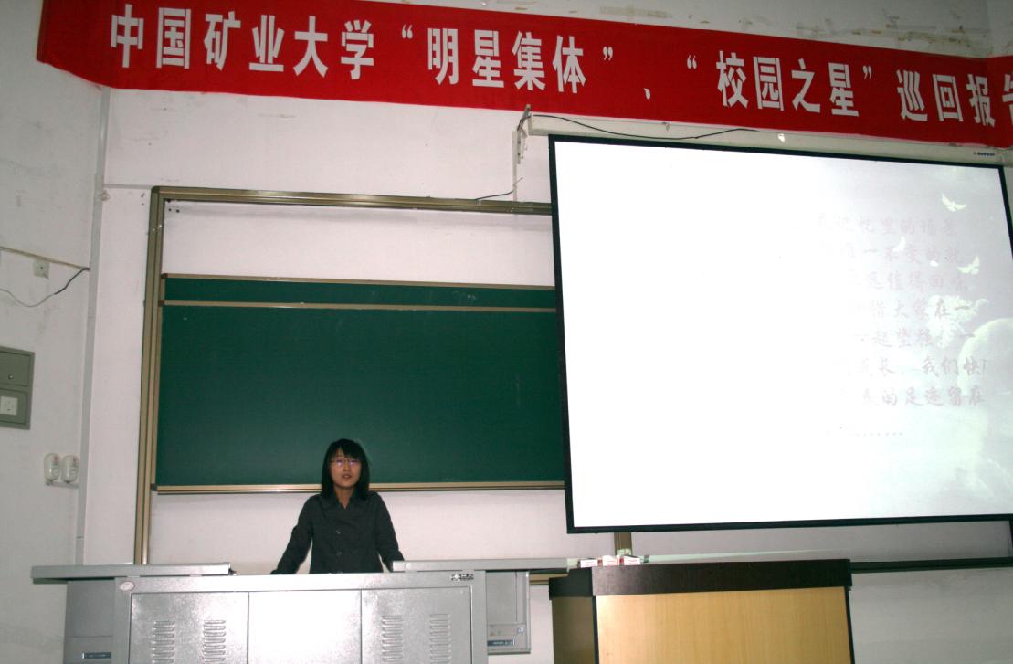 报告会上有六位来自不同学院的同学分别发表了自己对大学生活的感言。他们分别是“明星集体”的负责人—计算机学院计科06-2班的曾希君;“星级宿舍”的负责人—建工学院工程管理07-1班的王艺琛;“学习优秀”之星—理学院数学06-1班的岳晓蕊;“学习科研”之星—矿业学院采矿06-1班的白庆升;“自强不息”之星—安全学院消防06-2班的史波波及“社会活动”之星—管理学院市场营销07-4班的李倩。