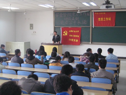 支部组织委员刘建安同学代表08级支部全体党员,在08级全体同学面前进行了郑重承诺。承诺内容结合学院党委要求和我支部实际情况,紧紧围绕“求真务实,落实本质基础工作”和“推进创先争优活动,开展支部特色活动工作”两个方面展开,并提出了诸如建立党员与同学学习生活“一帮一”小组、组建“互相监督”小组、建立“党员先行”交流会、设置支部信箱等一系列实事求是的措施,以求切实做到工作的透明化,树立起党支部的光辉形象。