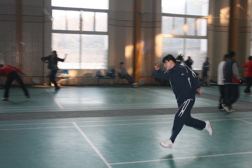 在12月4日与后勤代表队的比赛中,双方实力相当,比赛异常激烈,只见羽毛球在空中不断地来回飞逝,你攻我守,比分交替上升,老师们时而扣杀,时而吊球。精湛娴熟的技术赢得了现场观众的阵阵喝彩,海角社区