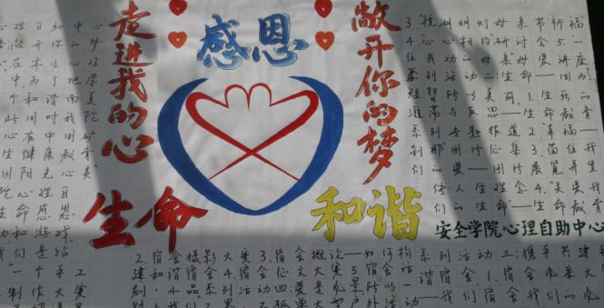 的心理健康活动月,安全学院心理自助中心积极响应校大学生心理健康教育中心“和谐校园 阳光心灵”的主题,特在此次活动月中举行以“生命 感恩 和谐”为主题的专题活动。