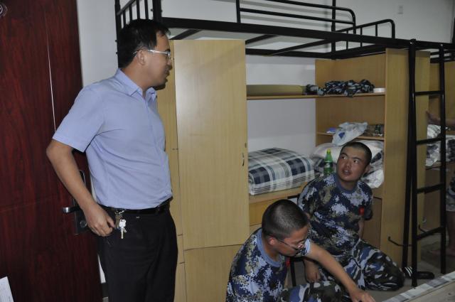 周福宝院长来到2015级新生宿舍,视察内务整理情况,对军训宿舍内务整理提出了具体要求。他说,新生上好大学第一课要从军训开始,要高标准严要求做好内务整理工作。他要求年级辅导员和各班做好组织工作,做好军训保障工作,全面、高效地做好内务整理工作。在新生宿舍,周院长详细询问新生家庭情况、来校饮食情况、环境适应情况等,在消防专业新生宿舍,周院长与学生亲切交谈,他告诉大家,消防工程是国家的重点学科,消防专业的学生今后都将成为国家不可或缺的栋梁。他鼓励同学们认真学好专业知识,掌握扎实的基础,将来大有可为。