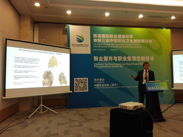 院长周福宝教授主持,来自中国、美国、德国等国家的专家参加本次论坛报告与研讨。论坛分别就新型干式过滤降尘技术、持续性个体粉尘监测仪、除尘滤料的发展、露天矿运输扬尘流场模拟、金属矿山井下粉尘污染控制、国内外呼吸防护装备标准体系、粉尘防爆领域的管理及标准、焊接作业的呼吸防护、爆炸性粉尘环境中呼吸性粉尘的防护、粉尘爆炸预防等议题做了主题报告与深入讨论。与会代表一致认为,粉尘的危害既要关注有爆炸性粉尘的爆炸危害,更要持续关注粉尘对广大职业工人所造成的健康危害。本次国际论坛报告展现了众多新技术,其中,由海角社区