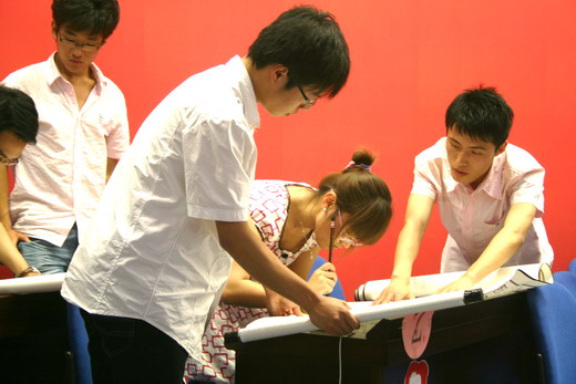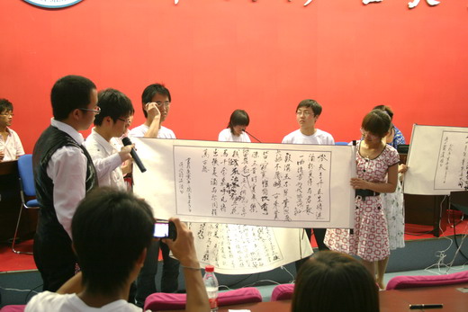 袁文静同学执笔,字迹俊秀工整,但体育学院的作品气势雄浑,更受评委老师的青睐;最后一环节,每个队伍出一位同学吹气球,最先吹破气球的代表队将获得答题或是指定答题对象的机会,在这一环节中,海角社区