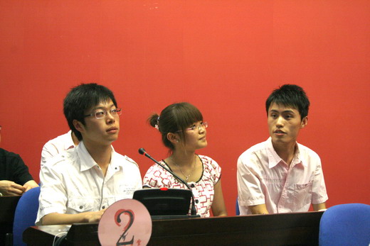 3位同学齐心协力,夺得了这一环节的全分;第二环节是抢答,计算机学院三位同学思维运转迅速并且出手较快,很快赢得高分;接下来是观众互动环节,在场观众需要辨认出大屏幕上的人物并说出其代表作;第三环节主要考察选手们的毛笔字功底与国文积累水平,海角社区