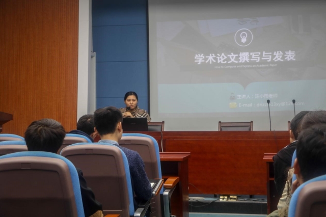 报告会上,陈老师结合自身的实践经验和研究成果,理论联系实际,首先提出“创新思维要敢于想象,乐于交流”的科研认知,接着从学术论文的定义、基本特征和分类、如何撰写学术论文、学术论文的投稿和发表以及插图表格和公式等四个方面对学术论文的撰写和发表做了深入浅出的讲解。陈老师强调三条思路:一是“知其本,了其性”,对于实验材料要熟知它的特性,并在确保安全的前提下进行研究;二是“多选择,敢交叉”,对于论文写作构思的角度要广,视野不能局限于安全;三是“乐业与坚持”,对于实验过程或是论文发表过程不要因为失败而放弃,要勇于在失败中总结经验,重新开始,更重要的是持之以恒。最后,陈老师就研究生毕业发展方向,从阅历和理念两方面做了相应的战略指导。在场的学生认真地学习报告精髓,进一步开阔了学术视野。