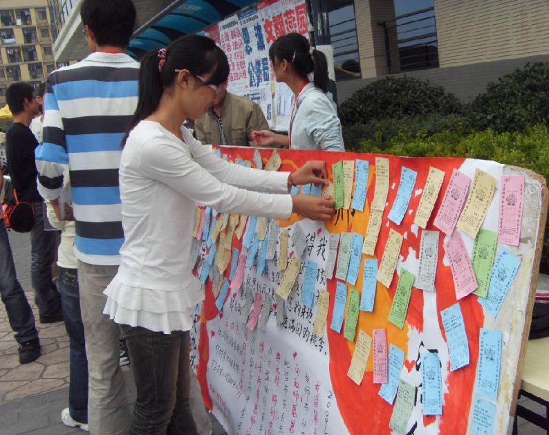 心理自助中心、化工学院义务家教社和材料学院青协烛光体一同制作的迎教师节展板,在一食堂展出。每个走过的学生都会在五彩的便签纸上写上自己对老师最诚挚的祝福。之后,他们又将这些漂亮的便签纸粘到展报上,让过往的教师读到同学们对他们的谢意和祝福,感受到学生们送出的满满的温暖。