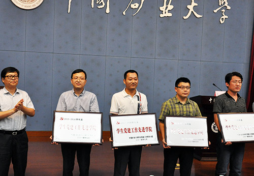 一批基层党组织和个人受到表彰。院长周福宝教授荣获“江苏省高等学校优秀共产党员标兵”称号。煤矿瓦斯治理研究所第一党支部、矿井通风与防灭火第一党支部被评为“2012-2014年度校级先进党支部”;钱雄荣获“优秀党务工作者”称号;孙留涛、王亮等2人荣获“优秀共产党员”称号;王青祥同学被评为“优秀大学生共产党员”。在2013-2014学年度学生党建评优中,海角社区
