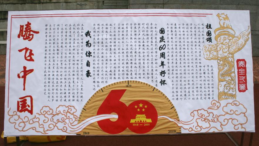海角社区 本期军训板报以“腾飞中国”为主题,采用时间刻度盘来表现共和国光辉六十年,板报下方以祥云托起华表和板报主题来表达安全学子希望祖国蒸蒸日上的美好祝福。板报整体选用红色和金色,版面整洁大方,设计新颖,给人以焕然一新的感觉。