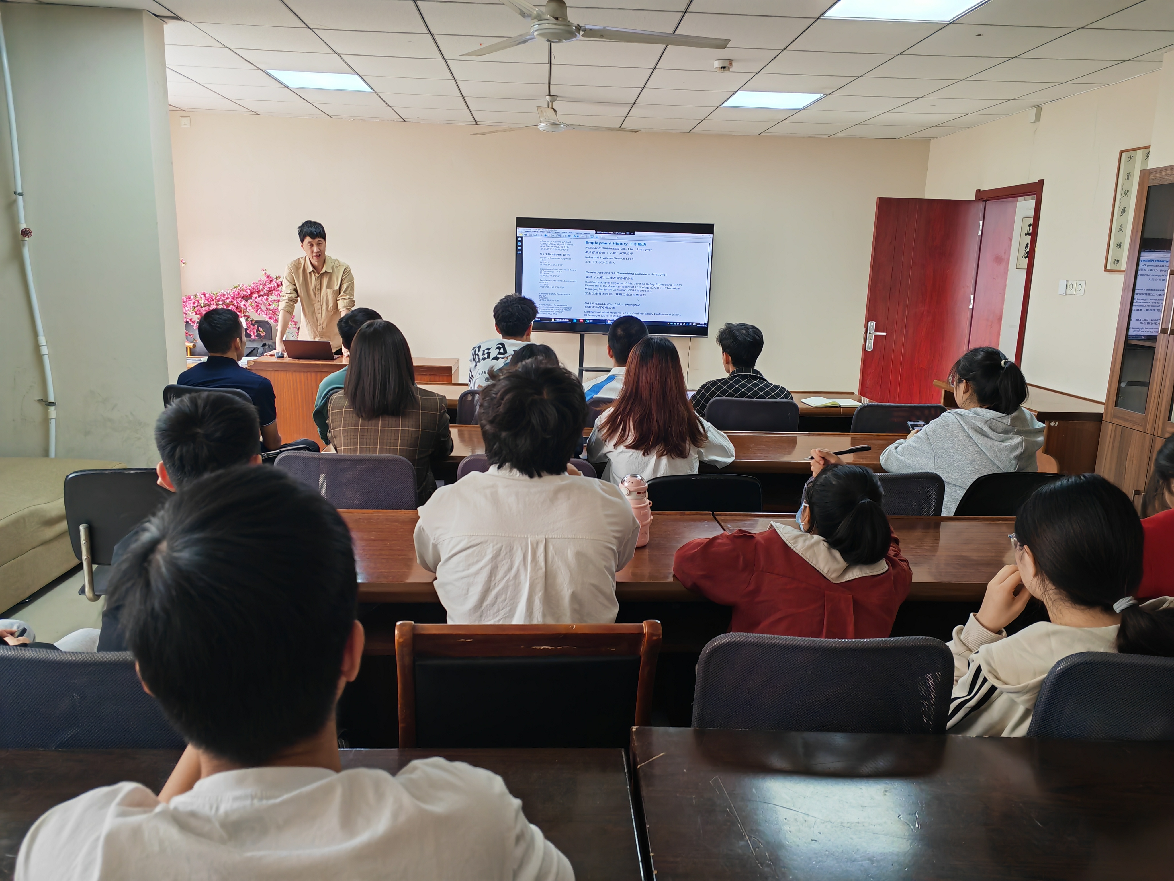 座谈会前,张佳维总经理在行健书院求是堂开展了2020级职业卫生工程专业学生的招聘宣讲,介绍了企业理念和公司福利待遇、晋升通道、招聘要求,并就同学们提出的问题进行了解答。
