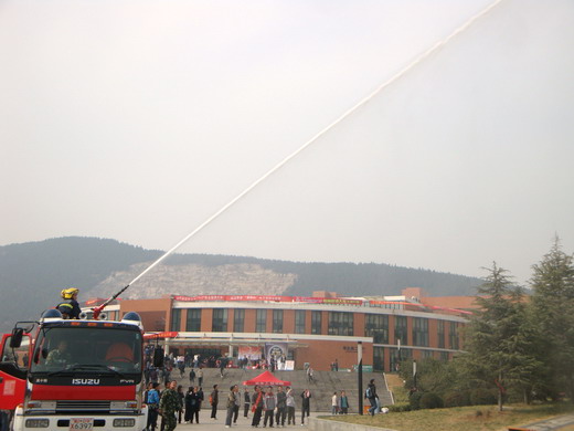 中午12:00,现场活动气氛达到最高点。消防战士迅速就位,以广场为实验场地进行了高压喷水演习,顿时警笛响起,冲天的水柱洒满花园,场面极为壮观,赢得了在场同学们的阵阵赞叹,最终活动画上了圆满的句号。