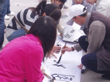 活动现场,在工作人员的热情宣传,大力发动和积极组织下,同学们积极参与活动,纷纷在巨幅画布上留言、签名,写下了自己对奥运的祝福和期望;有的同学在画布上浓情绘画,尽情展示自己的艺术风采,同时也写出了自己对奥运的祝福与期待,画出对奥运的美好憧憬。在活动过程中,书法大师侯德义老师来到我们活动现场亲手写下了自己对奥运的祝福:“同一个世界,同一个梦想”。鲜艳的水彩、简单的素描、潇洒的题词,无一不表现了同学们对奥运的期待。最后,同学们纷纷争着在画布上签下自己的名字,与奥运同行。