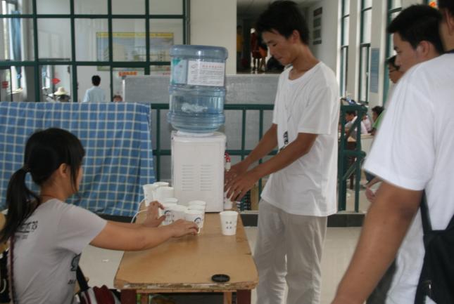 青年志愿者协会成员组成,专门为在宿舍搬迁中劳累的同学们提供饮用水等服务。他们在紧张的工作中抽出时间以自己独特的方式默默地奉献着爱心,为同学们提供服务。“学院为我们做的很周到,他们能抽出时间为我们服务,虽然只是一杯水,但的却给了我们很大的方便,真的很感激。”一位同学深有体会的说。