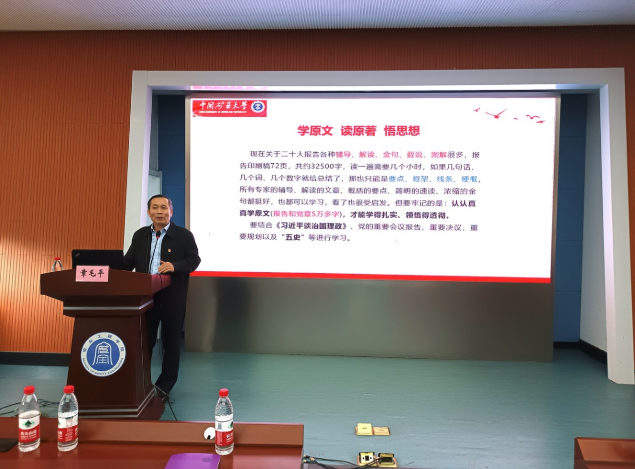 在矿业科学中心A200报告厅举行学习贯彻党的二十大精神宣讲报告会,校巡回宣讲团成员、工会主席章毛平应邀做宣讲报告。报告会由院党委书记曲颂主持,院党委中心组成员及全体教职工参加报告会。