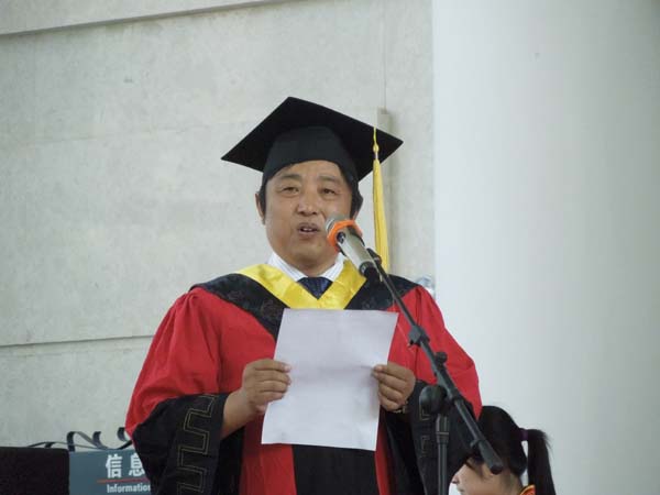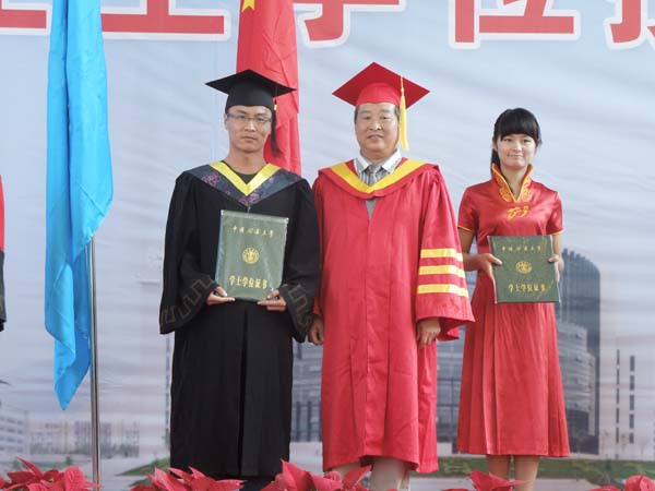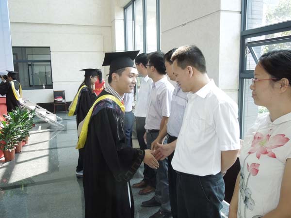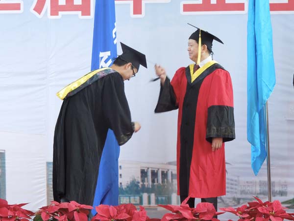 仪式上,李增华副院长首先向大家简单的介绍了今天到场的嘉宾,随后由来袁亮院长亲自为每一位毕业生拨流苏,并高兴地祝贺每一位毕业生,亲切地与他们合影留念。紧接着曾勇教授为每一位毕业生颁发了学位证书,并亲切地与毕业生握手表示祝贺,合影留念。下台后毕业生们怀着满心的喜悦,向诸位教授鞠躬、握手,感谢老师们的谆谆教导。