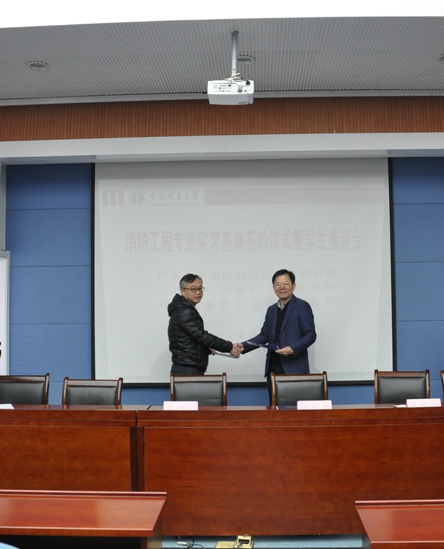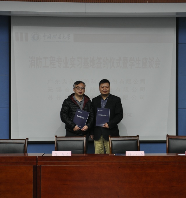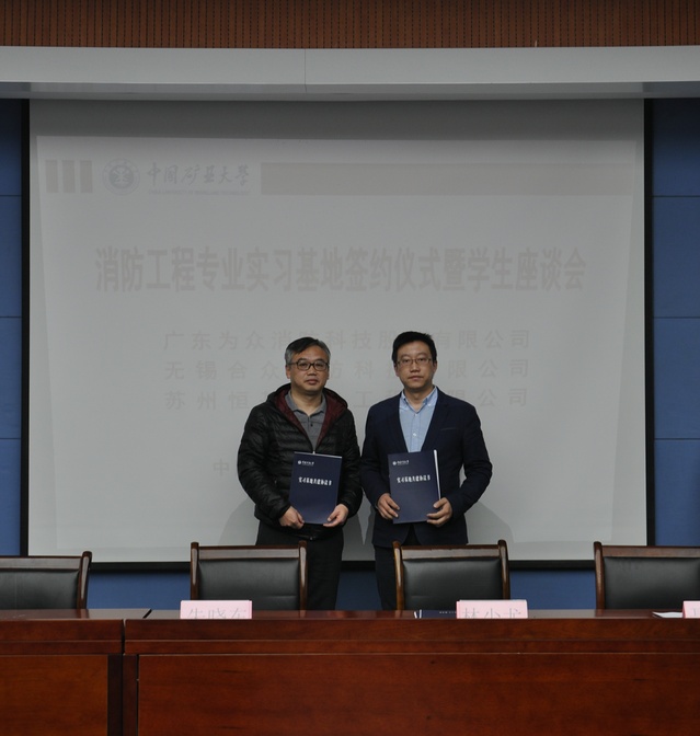 与广东为众消防科技股份有限公司、无锡合众消防科技有限公司及苏州恒基机电工程有限公司合作共建消防工程专业实习基地签约仪式在矿科A200举行。安全学院副院长朱晓东,广东为众消防科技股份有限公司董事长林少尤、总经理聂胜红,无锡合众消防科技有限公司总经理张忠兵,苏州恒基机电工程有限公司工程部经理周庆杰,海角社区