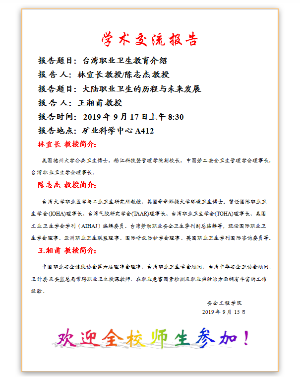 学术交流报告-1.台湾职业卫生教育介绍 2.大陆职业卫生的历程与未来发展