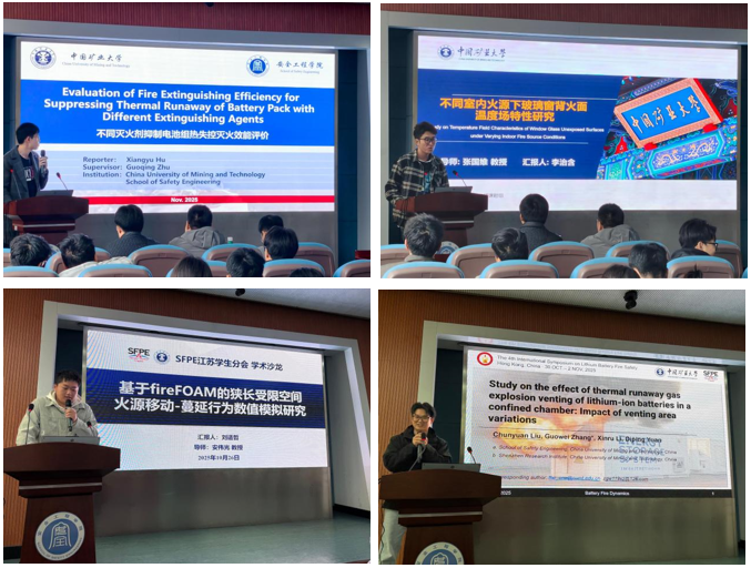 本次学术沙龙由SFPE江苏学生分会主席2024级博士生胡翔宇主持。主讲的硕博生采用中英文结合的方式进行了汇报发表:李治含提出了通过室外玻璃温度反推室内火源位置的新思路;胡翔宇以量化模型对比了不同灭火剂抑制动力电池热失控的效能;刘适哲开发了基于LES和滑移网格技术的移动载体火蔓延CFD求解器;刘淳元揭示了封闭空间内锂离子电池热失控泄爆面积与峰值压力的定量关系;张世勇系统评估了干冰对锂离子电池火灾的抑制效能;余先宇构建了钠离子电池热力耦合热失控预警模型;翟靖骢优化拱顶地铁站排烟口参数使排烟效率显著提升。